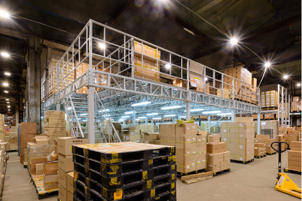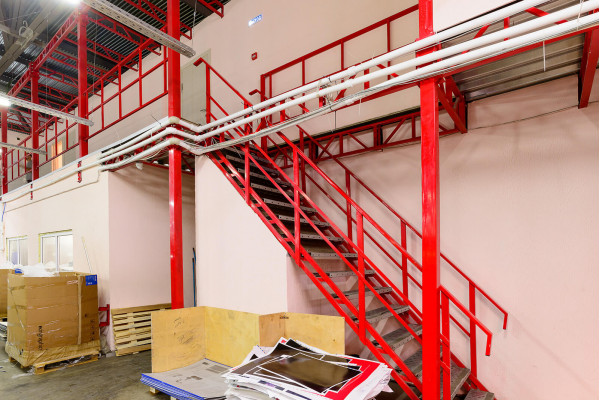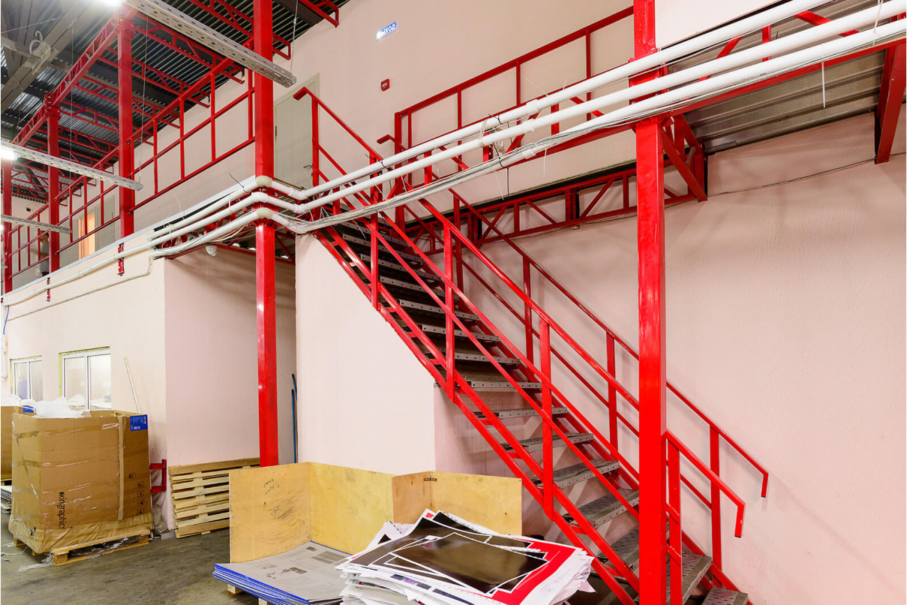 Конструкция оборудована элементами безопасности и лестницами, в зависимости от использования - проемами или зонами для вертикального перемещения грузов при помощи встроенных грузовых подъёмников, подъёмных столов или напольного подьемно-транспортного оборудования. Конструктивные особенности мезонина позволяют разместить на его этажах необходимые технические коммуникации, системы пожаротушения и освещения в строгом соответствии с установленными правилами.